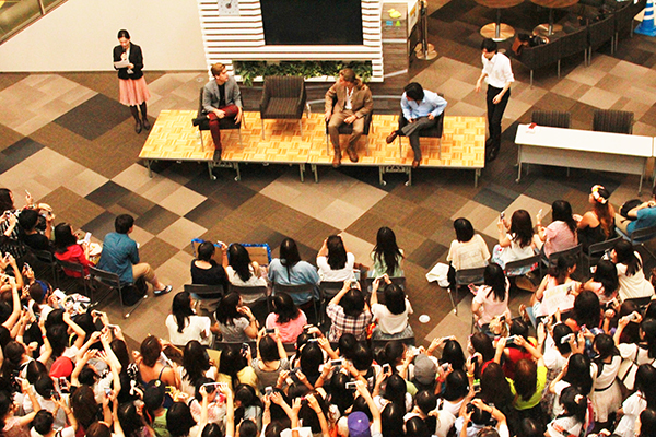その後、イオンモールレイクタウンへ移動し、事前に選ばれた400名前後の10代・20代の女性ファンたちを主に迎えて「トークショー&交流会」を開催。今回が、米ディズニー・チャンネルの主演俳優が来日するのが初めてということもあり、事前に驚くほどの日本のディズニーファンから応募をいただきました。小山田真会長も、米ディズニーチャンネルの実写映画で唯一日本人として主演を抜擢し、ディラン&コールと小山田がステージに壇上しました。1時間前後、日本についての印象や大学教育の大切さを強調し、撮影の裏話やプライベート生活の話を共有していただきました。その後、30分前後質疑応答を行い、積極的に観客からたくさんな質問を受け付けました。