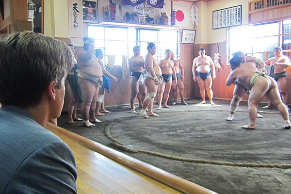 2日目は、まず日本相撲協会の協力により日本の伝統文化である大相撲を見学するために境川部屋を訪問。迫力のある朝稽古を30分前後見学し、親方からトレーニングや相撲について少しお話をいただきました。なかなか大相撲の朝稽古を見学する機会がないため、訪日中のディランとコールだけでなく同行した日本人金記者たちもとても喜んでいました。テレビで見る大華やかな大相撲も、日々の厳しい稽古を積み重ねた象徴だと言うことがよく理解でき、これからも応援していきたい思うひと時でした。