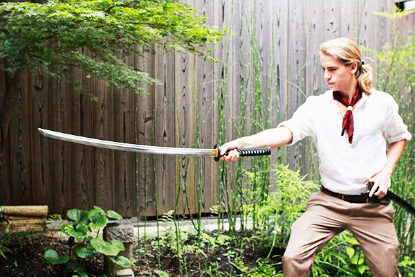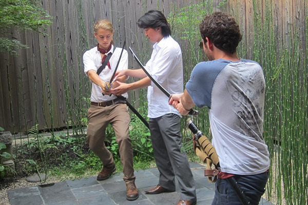 その後、日本刀や甲冑を拝見するため京都東山堂へ移動。そこで、とても興味深く実際に本物の甲冑を拝見し、日本刀を手に取り小山田会長の指導のもと刀の正しい持ち方や振り方を簡単に教わりました。あまりアメリカでは普段手に触れるようなものではないのでとても関心を持っておりました。