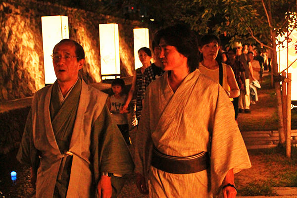 浴衣を着たまま、二条城へ移動し、門川京都市長らと合流。その夜は、二条城でプロジェクトマッピングがされており二条城に映し出される映像を楽しみました。門川市長とも会話が弾み、そのまま京の七夕を散策するために関係者含めて移動。京の七夕は、毎年開催されています。