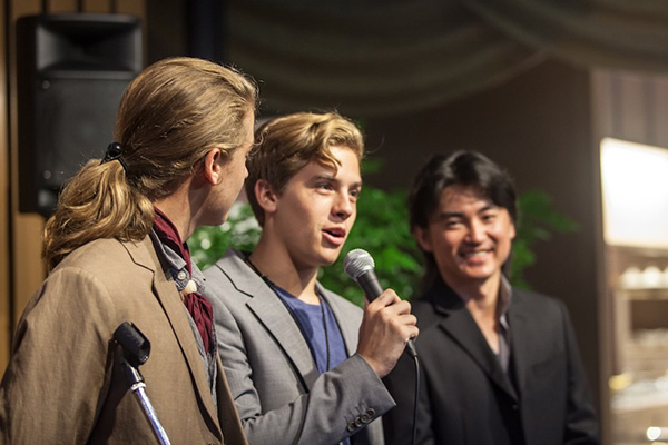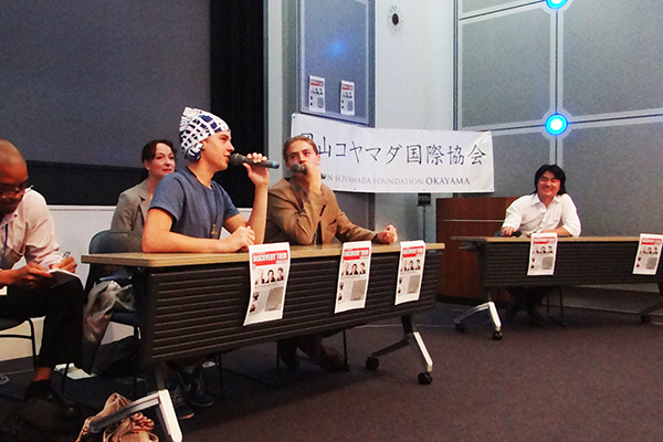 その後は、岡山市内へ移動し、年間来館数と年間個人貸出札数が日本一の岡山県立図書館で、主に学生を対象にトークショー&交流会を実施しました。色々な都道府県からこのイベントに参加するために来館されており、1時間前後、ディランとコールから教育の大切さ、これまでの日本の印象、撮影の裏話やプライベート生活の話を現地ボランティアのアメリカ人の方から通訳をしていただき英語でトークしてくださりました。参加者からも積極的に、学んだ英語で積極的な質問がとびかり時間いっぱい相互の質疑応答が実施できました。