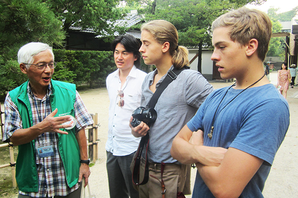 当園では、岡山県の支援もあり英語ボランティアガイドの案内のもと、当園の歴史や魅力を具体的に説明してくださりました。ディランとコールもとても喜んでおり、持参したカメラで色々なところを写真撮影し、1時間前後、散策を満喫。