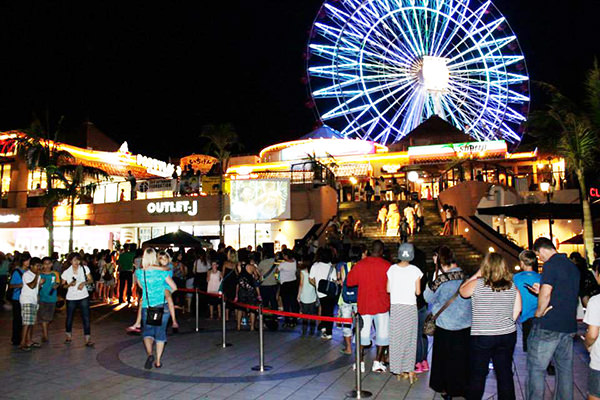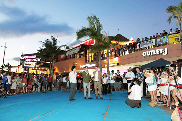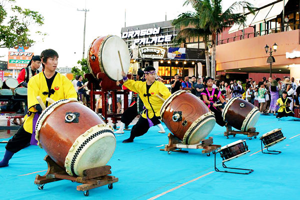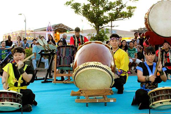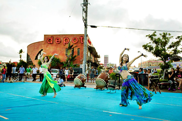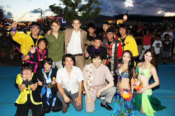 那覇から北西に位置する北谷町へ移動し、北谷町の美浜アメリカンビレッジにてKIF沖縄主幹の屋外ウェルカムパーティーに参加しました。イベント会場には、500名以上の地元の若者たちや米軍基地の家族や関係者たちが列に並んで待っていました。そこで、地元の方達による和太鼓の演奏やベリーダンスなどを披露していただきました。とても迫力のある演技でディランとコールも感激していました。